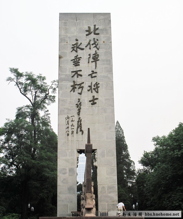 郑州碧沙岗公园,老郑州人称之为“老冯义地”。,为时任河南省政府主席的冯玉祥,为纪念近两年征战中殉难的官兵,他拨款13万元,命令当时任冯部交通司令的许骧云在郑州建一英烈祠,以表对阵亡将士之志。  这个地方原来是一片叫白沙岗的荒地,陵园建成改名碧沙岗。他还亲笔提名“碧沙岗”,并以石雕刻、嵌在北门之上。陵园内还修三民主义纪念亭,并立有碧血丹心纪念碑。陵园中部设祠堂,名“昭忠祠”。站在雄壮的北伐阵亡将士纪念 看着壁画上将士们英勇的冲锋姿态,不禁让人忆起那段宏伟的历史。